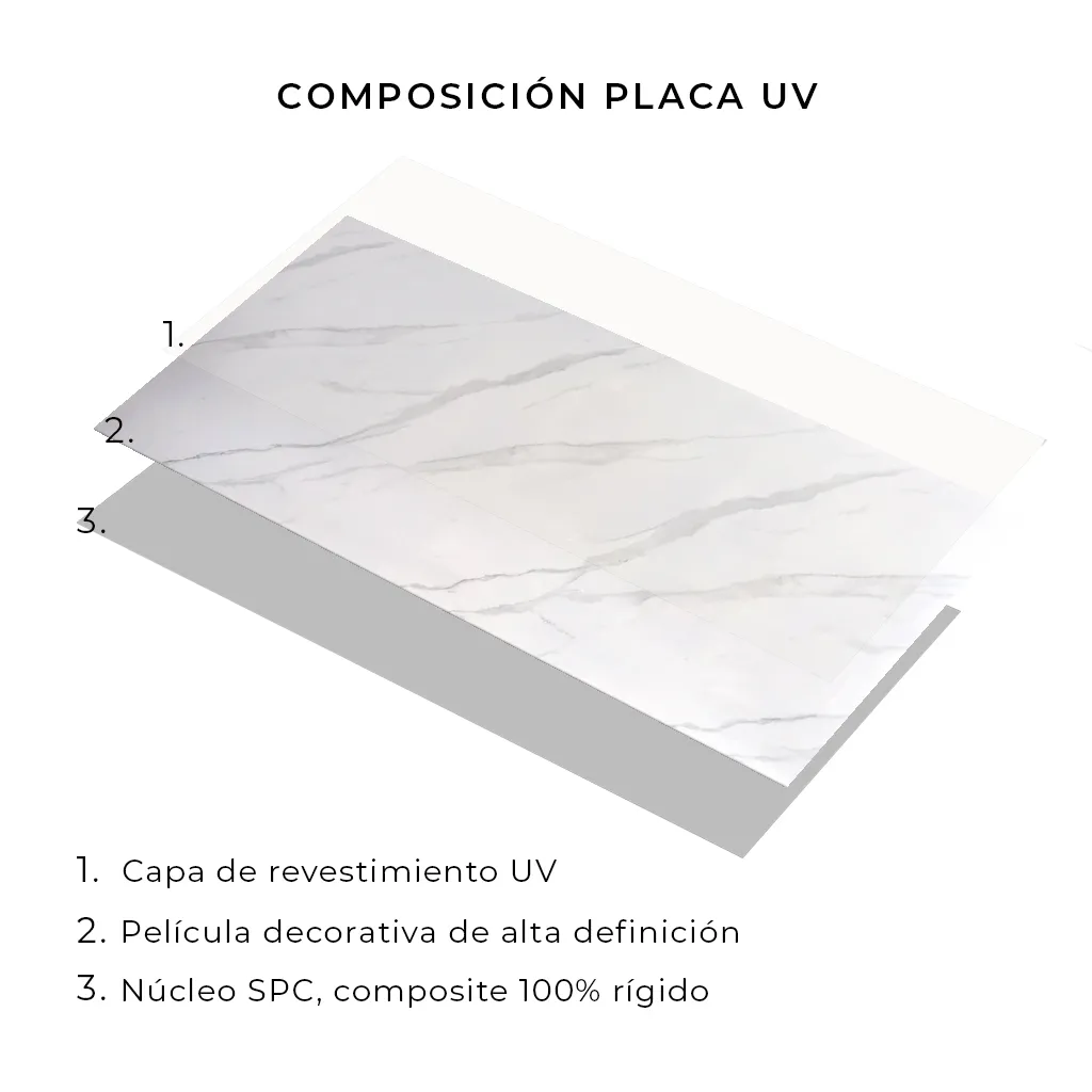 COMPOSICIÓN SPC: Composite 100% rígido. Incluye polvo de piedra, resinas y aditivos. Incluye capa de revestimiento UV.